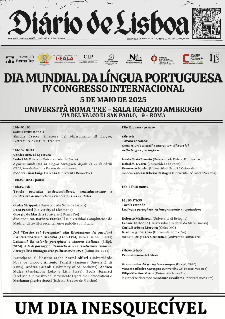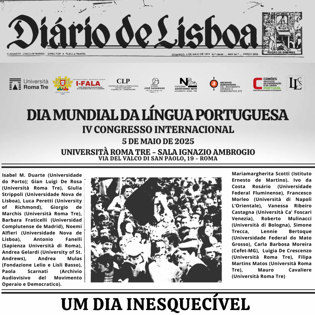 Partecipanti: Prof. Giorgio de Marchis (Università Roma Tre), Francisco Topa (Cátedra “Agostinho Neto” – Universidade do Porto), Dott.ssa Alice Girotto (Università Ca’ Foscari di Venezia), Prof. Roberto Francavilla (Università di Genova), Dott.ssa Noemi Alfieri (Universidade Nova de Lisboa – Centro de Humanidades), Prof.ssa Mariagrazia Russo (Università degli Studi Internazionali di Roma), Prof. Sérgio Paulo Guimarães Sousa (Universidade do Minho).